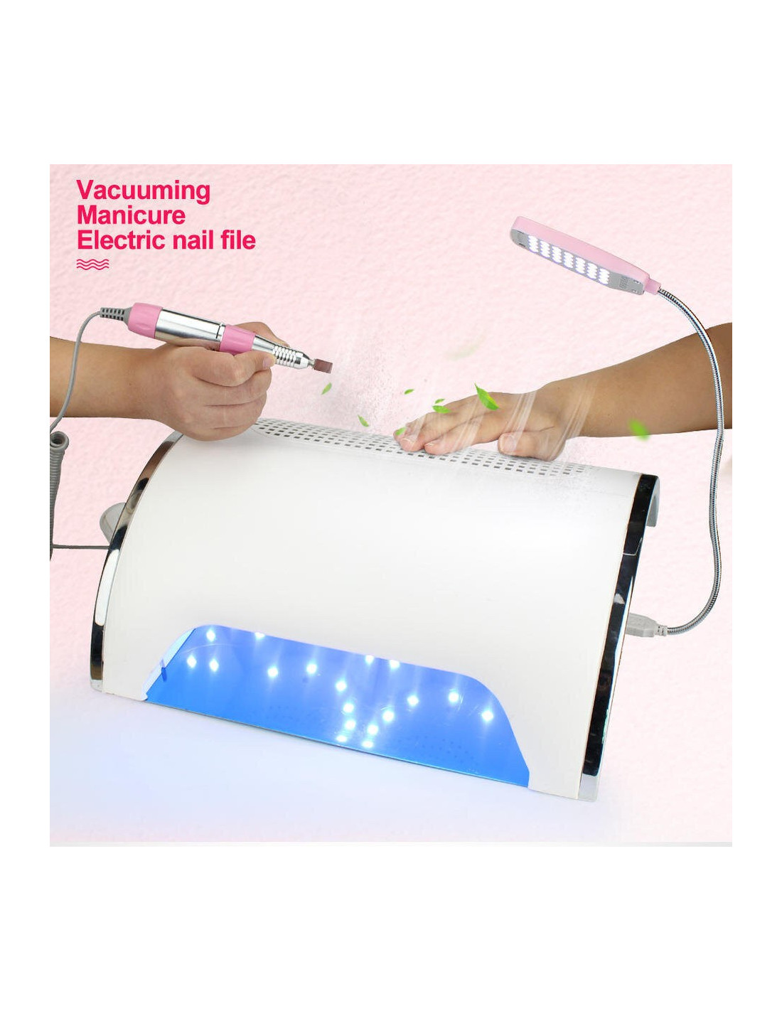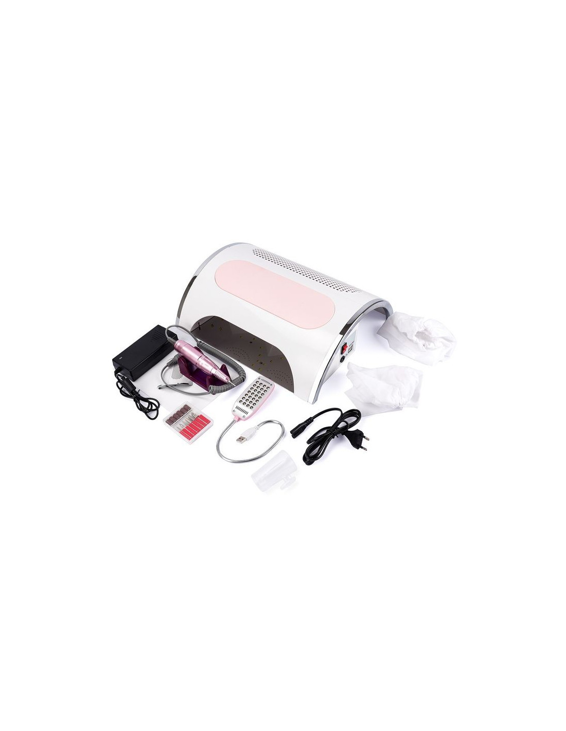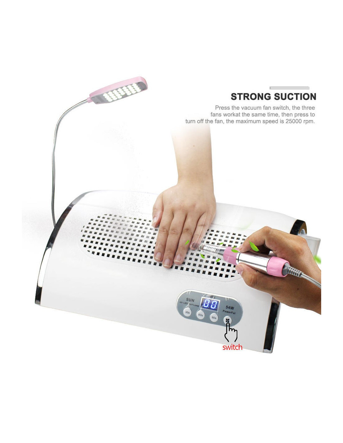 Lampe UV pour ponceuse à ongles 54W, aspirateur, collecteur de poussière, perceuse 25000 tr/min, Machine de manucure, dissolvant, outils de polissage * Caractéristique: Machine de nail art 1.3 en pour polir vos ongles, collecter la poussière des ongles, sécher les gels à ongles. Bonne qualité, mouvement super durable. 36 perles de lumière UV pour un séchage rapide. Lampe USB avec 28 perles de lumière blanche LED, permet de travailler dans une situation sombre. 3 ventilateurs peuvent aspirer la poussière rapidement et complètement. Forte puissance de 54W, faites fonctionner votre nail art rapidement et efficacement. Japon roulements importés, pas de chaleur et faible vibration avec un RÉGIME réglable (0-25000 TR/MIN), qui peut fonctionner en douceur et rapide. Avec sa taille compacte, il peut être facilement installé et démonté. Il est destiné à une utilisation professionnelle en salon et à une utilisation débutant à la maison ou au salon. * Le produit Comprend: 1 x Machine Principale 1 x stylo perceuse à ongles 1 x Lampe USB 1 x Six Types de forets à ongles de base 2 x Pièce de Soutien 1 x Adaptateur 1 x Cordon D'alimentation 2 x Filtre Sac 1 x Manuel 1 x Boîte